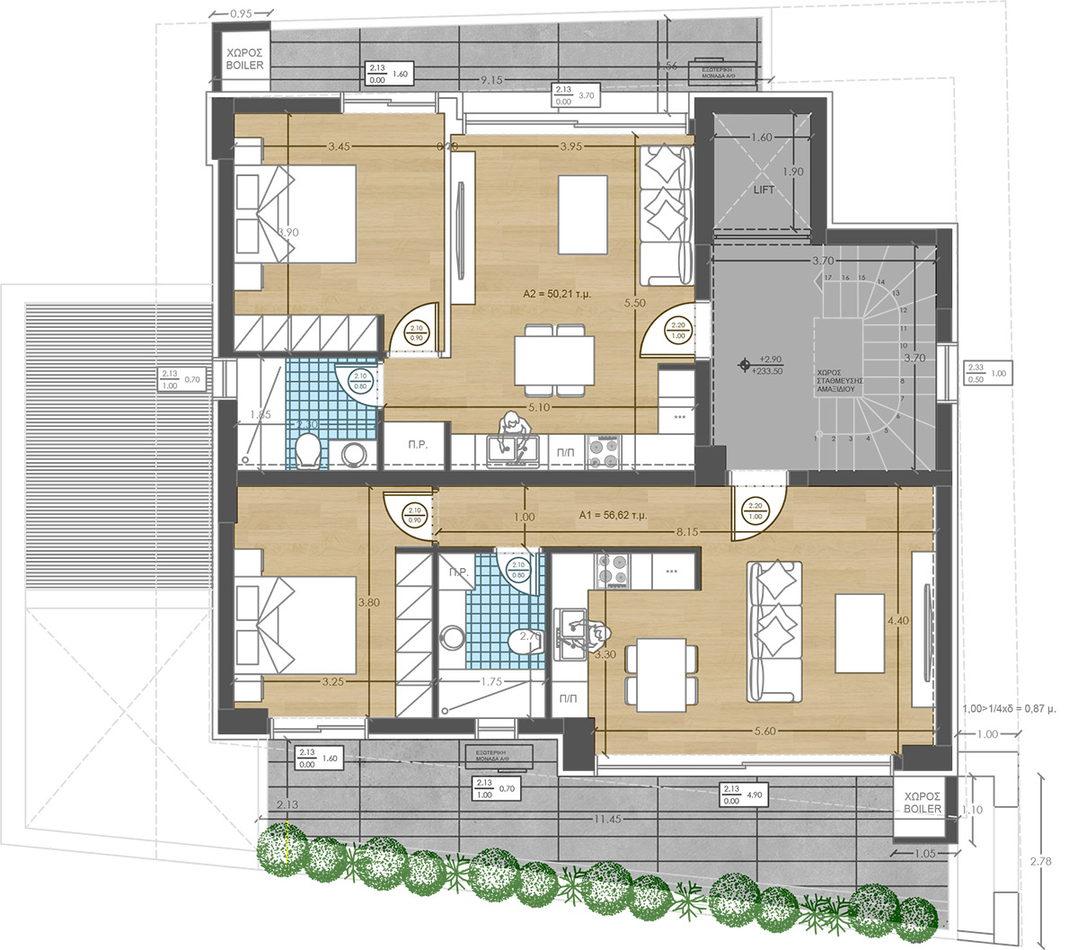 - Διαμέρισμα Α’ ορόφου 56.62 m2 με δύο θέσεις στάθμευσης στην Pilotis και αποθήκη στο υπόγειο.