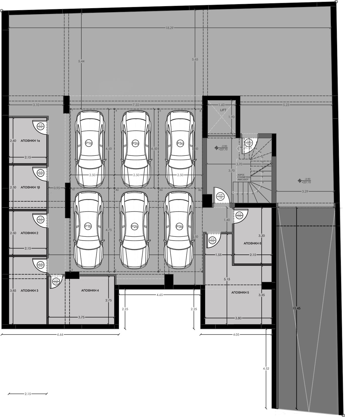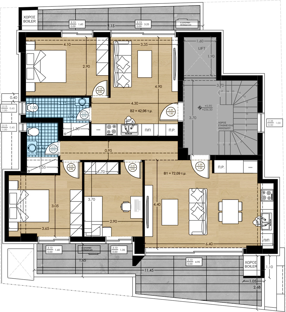 - Διαμέρισμα Β’ ορόφου 72.09 m2 με δύο θέσεις στάθμευσης στην Pilotis και αποθήκη στο υπόγειο.